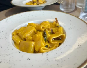 Ravioli con ripieno di carne, crema di zucca e scaglie di mandorle salate.
