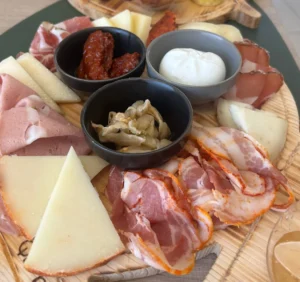 Pancetta tesa di suino nero; Capocollo di Calabria; Black Angus; Mortadella IGP artigianale; Finocchiona; Salamini a catenella; Nduja di Spilinga; Frutta Secca; Frutta Fresca; Focaccia e Grissini.