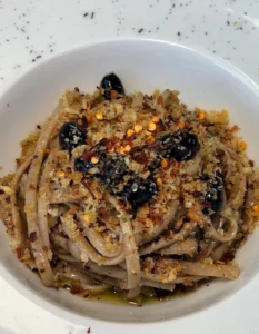 Stroncatura con alici, mollica di pane tostata e olive sinopolesi.
